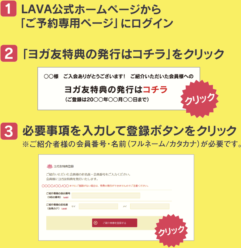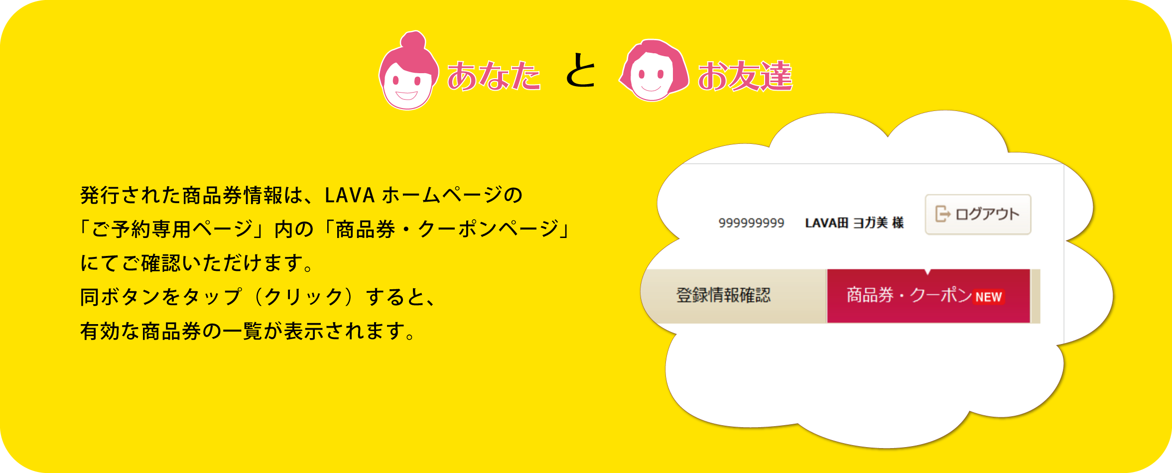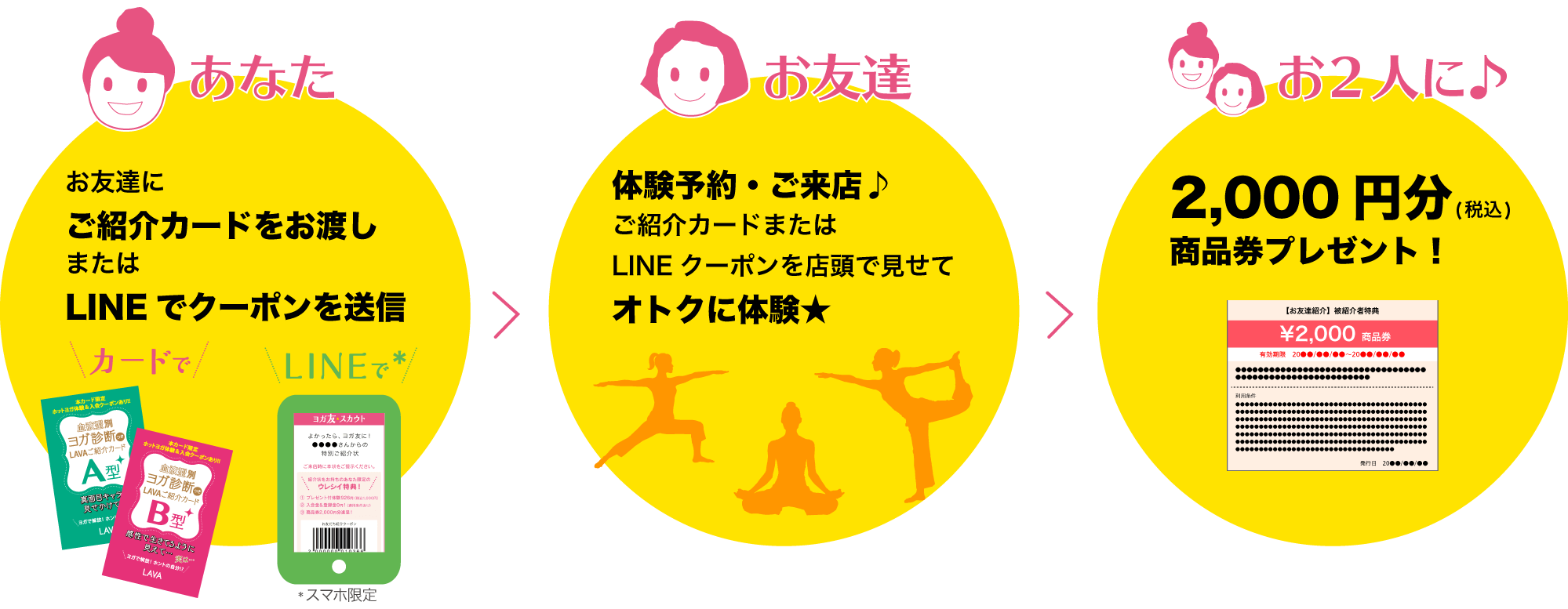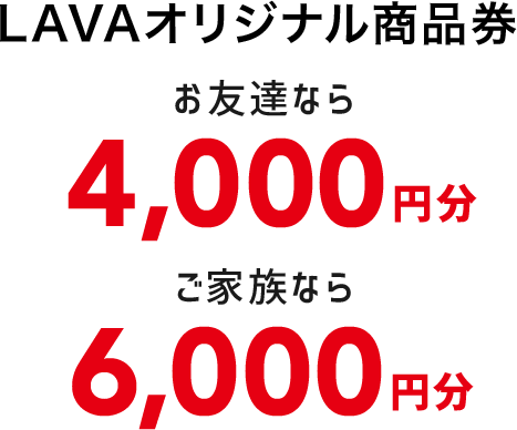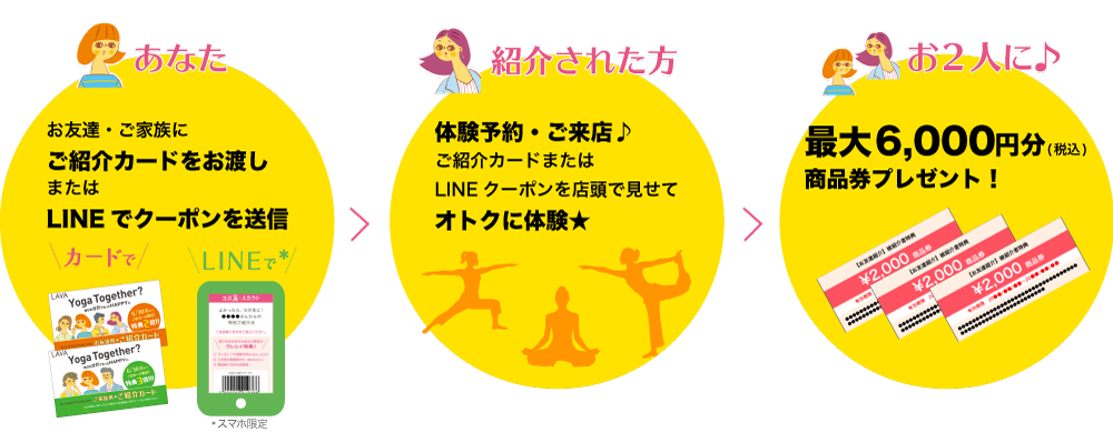 ※3 会員様からお送りいただいたLINEご紹介画面をご来店時に提示し、ご来店当日にご入会・マンスリー登録していただいた場合に限ります。お友達がご入会された翌々月中旬に会員様とお友達にそれぞれLAVAポイントを500円分ずつ追加でプレゼントいたします。