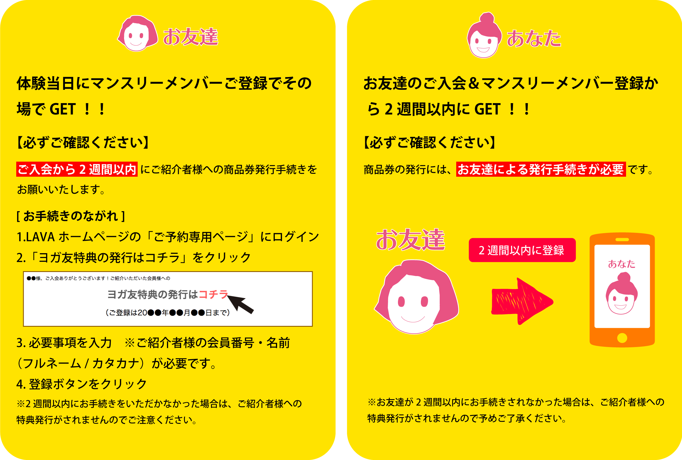 ※2 お友達が体験会受講当日にマンスリーメンバーへご登録していただいた場合[LAVA・Rintosull店舗(一部対象外店舗除く)]に限ります。会員様とお友達にそれぞれ10,000円分のLAVAポイントを5,000円分×2ヶ月に分けてプレゼントいたします(お友達がマンスリーメンバーご登録時と、その翌月の中旬)。会員様とお友達のポイントは同日に付与されない場合がございます。ポイントは、1pt=1円としてLAVA店頭500円以上、Lapre(LAVAオンラインストア)100円以上のお買いもので100円単位でご利用いただけます。マンスリーメンバー月額料金や1回券などのレッスン料金、キャンペーン商品、レンタル商品、一部商品にはご利用いただけません。