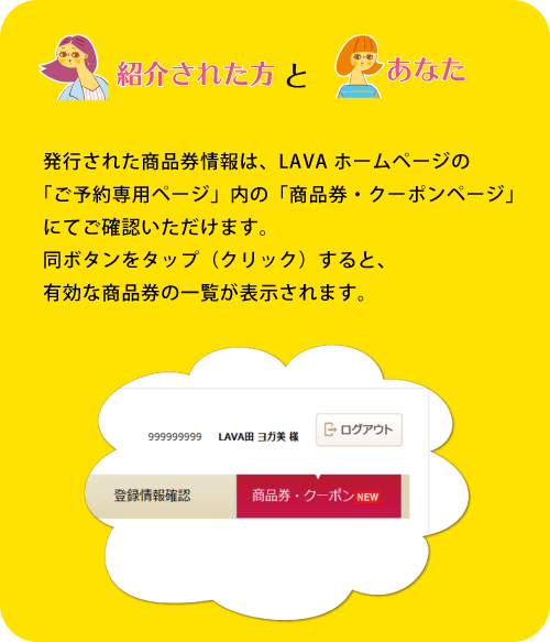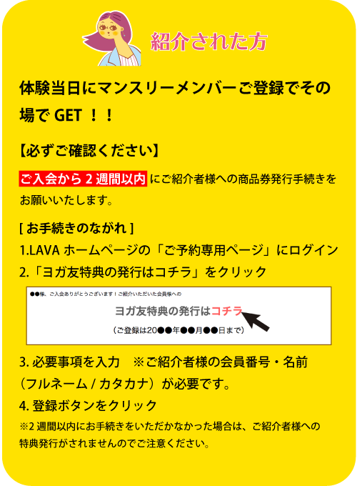 ご来店時にご紹介いただいた会員様の会員番号とお名前が不明な場合はLAVAポイントが付与できないため、ご登録・申込日から2週間以内に下記の流れに沿って、ご紹介者様へのLAVAポイント発行の手続きをお願いいたします。