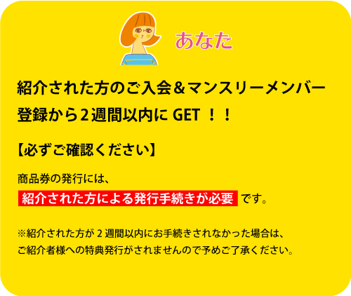 2週間以内にお手続きをいただかなかった場合は、ご紹介者様への特典発行がされませんのでご注意ください。