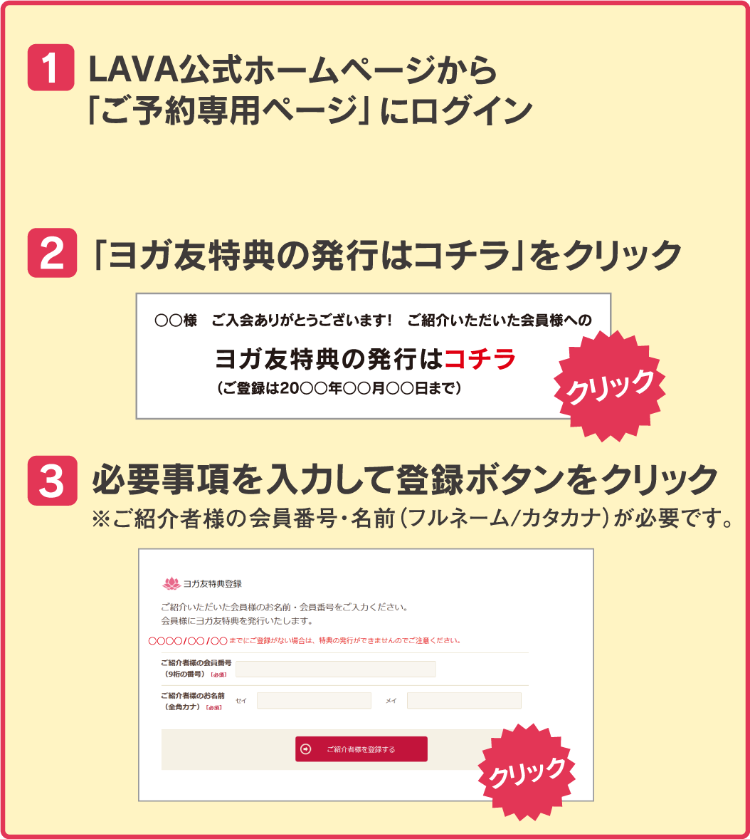 - ご来店時にご紹介いただいた会員様の会員番号とお名前が不明な場合はLAVAポイントが付与できないため、ご登録・申込日から2週間以内に下記の流れに沿って、ご紹介者様へのLAVAポイント発行の手続きをお願いいたします。