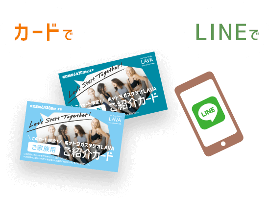 STEP1 LAVA会員様から招待状をもらう LAVAに通うお友達から、LINEで招待状URLを送ってもらう。直接会える方は紙の「特別招待状」をもらってもOK♪ STEP2 体験レッスンを予約⇒受講 希望のスタジオ・レッスンを選択して予約する。体験当日、スタッフに招待状を見せて体験レッスン受講♪ STEP3 ご入会で限定特典GET♪ レッスン受講当日のご入会で、お二人にスペシャル特典プレゼント!さらに入会金&登録金0円!※ おトクな入会キャンペーンも♪ ※ご入会時のみ、施設使用料2,500円(税込)を頂戴いたします。