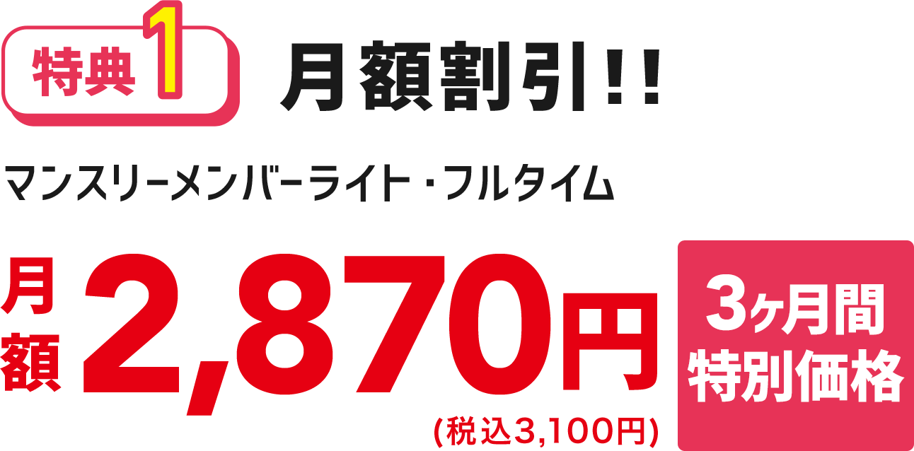 プレミアム通い放題プラン 月額3ヶ月間特別価格2,980円(税込) さらに!嬉しい5つの特典付き!
