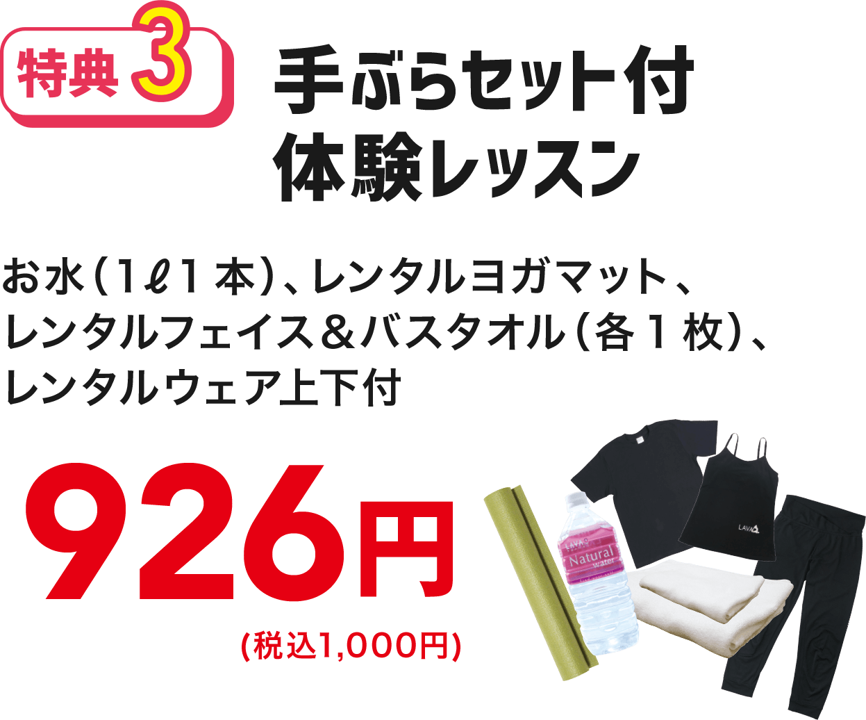 おためし再スタートプラン 月額3ヶ月間特別価格6,300円(税込) 登録金5,000円→0円 嬉しい特典 1.水素水飲み放題(水素水バッグ1個付き) 2.LAVA安心サポート 3.レンタルバスタオル&フェイスタオル 3ヶ月間0円