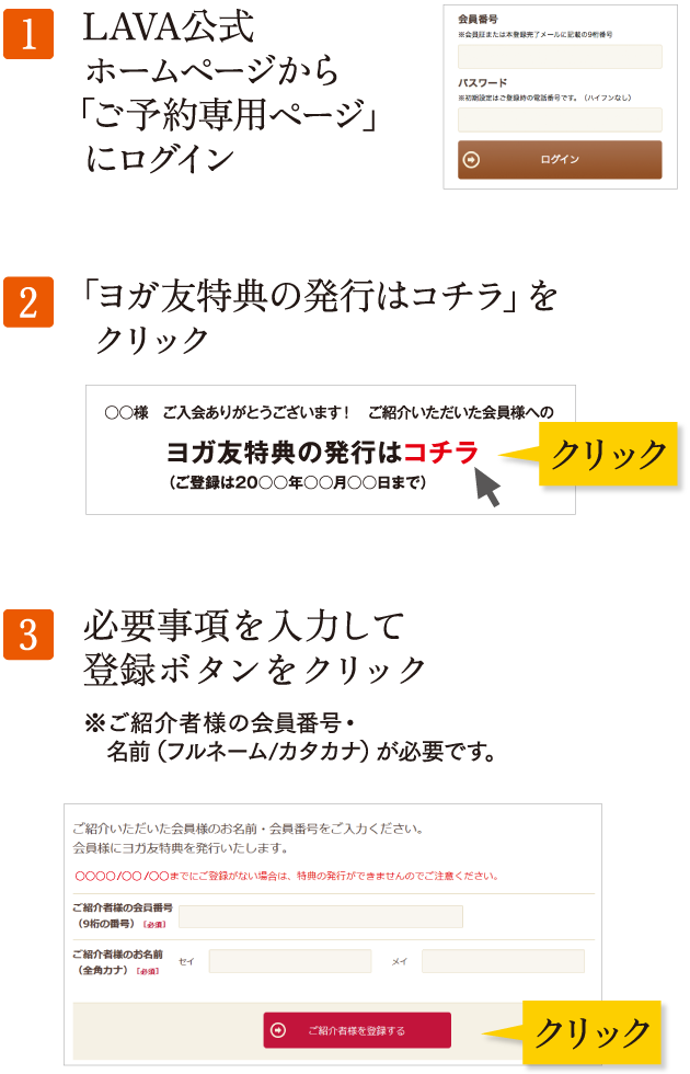ご来店時にご紹介いただいた会員様の会員番号とお名前が不明な場合はLAVAポイントが付与できないため、ご登録・申込日から2週間以内に下記の流れに沿って、ご紹介者様へのLAVAポイント発行の手続きをお願いいたします。