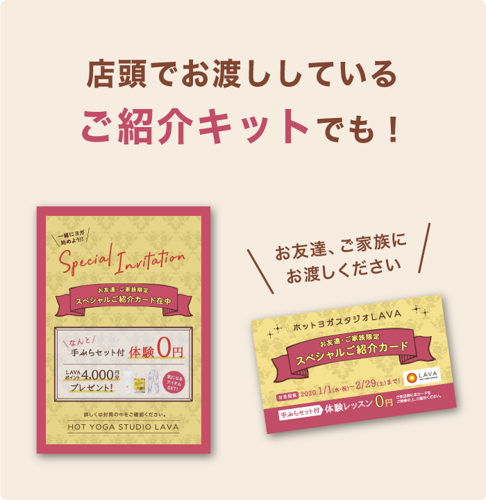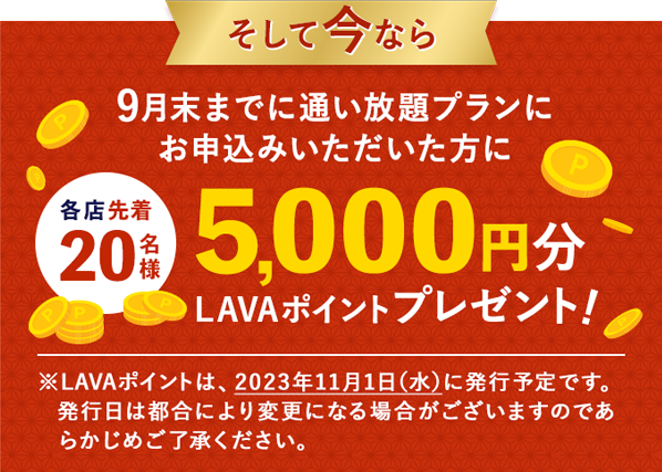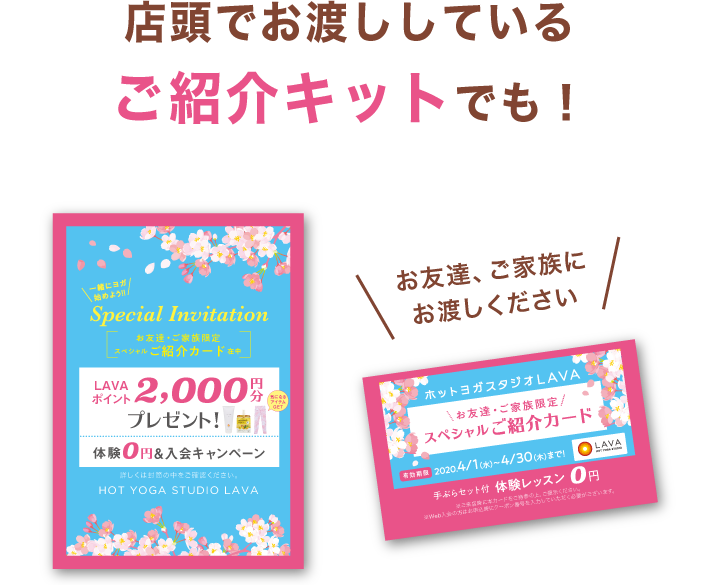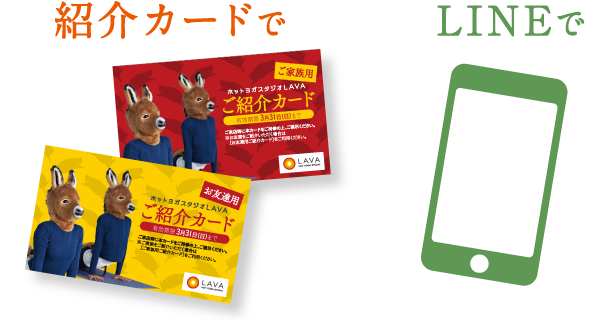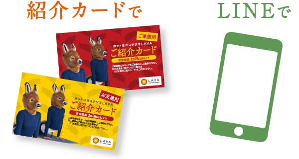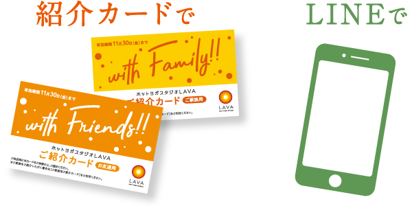 ※3 会員様からお送りいただいたLINEご紹介画面をご来店時に提示し、ご来店当日にご入会・マンスリー登録していただいた場合に限ります。お友達がご入会された翌々月中旬に会員様とお友達にそれぞれLAVAポイントを500円分ずつ追加でプレゼントいたします。