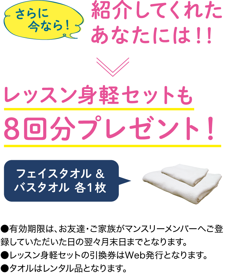 ※2 お友達が体験レッスンか見学会受講当日にマンスリーメンバーへご登録していただいた場合[LAVA・Rintosull店舗(一部対象外店舗除く)]に限ります。会員様とお友達にそれぞれ10,000円分のLAVAポイントを5,000円分×2ヶ月に分けてプレゼントいたします(お友達がマンスリーメンバーご登録時と、その翌月の中旬)。会員様とお友達のポイントは同日に付与されない場合がございます。ポイントは、1pt=1円としてLAVA店頭500円以上、Lapre(LAVAオンラインストア)100円以上のお買いもので100円単位でご利用いただけます。マンスリーメンバー月額料金や1回券などのレッスン料金、キャンペーン商品、レンタル商品、一部商品にはご利用いただけません。