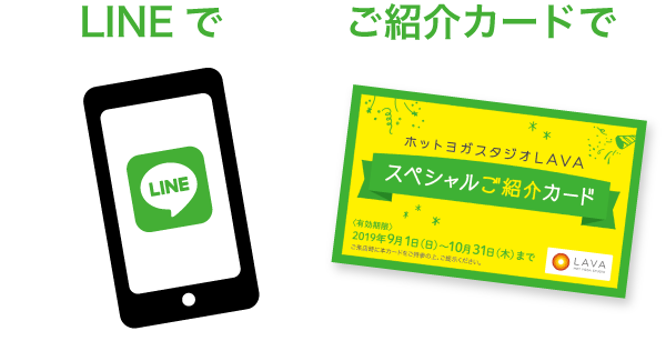 STEP1 LAVA会員様から招待状をもらう LAVAに通うお友達から、LINEで招待状URLを送ってもらう。直接会える方は紙の「特別招待状」をもらってもOK♪ STEP2 体験レッスンを予約⇒受講 希望のスタジオ・レッスンを選択して予約する。体験当日、スタッフに招待状を見せて体験レッスン受講♪ STEP3 ご入会で限定特典GET♪ レッスン受講当日のご入会で、お二人にスペシャル特典プレゼント!さらに入会金&登録金0円!※ おトクな入会キャンペーンも♪ ※ご入会時のみ、施設使用料2,500円(税込)を頂戴いたします。