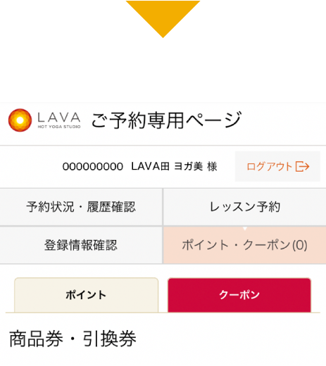- 発行されたLAVAポイント情報は、LAVA公式ホームページの「ご予約専用ページ」内の「ポイント・クーポンページ」または、LAVA公式アプリにてご確認いただけます。同ボタンをタップ(クリック)すると、有効なLAVAポイントの一覧が表示されます。一部LAVAポイントの発行方法が異なる場合がございます。