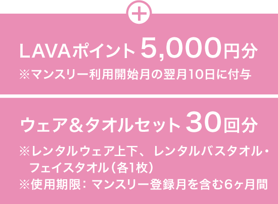 さらに 嬉しい5つの特典付き 1.入会金5,000円→0円 2.登録金5,000円→0円 3.水素水飲み放題 3ヶ月間0円 4.LAVA安心サポート 3ヶ月間0円 5.レンタルバスタオル&フェイスタオル 3ヶ月間0円