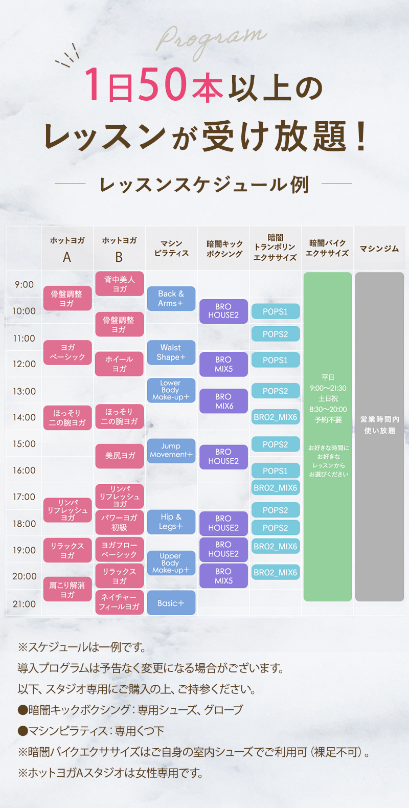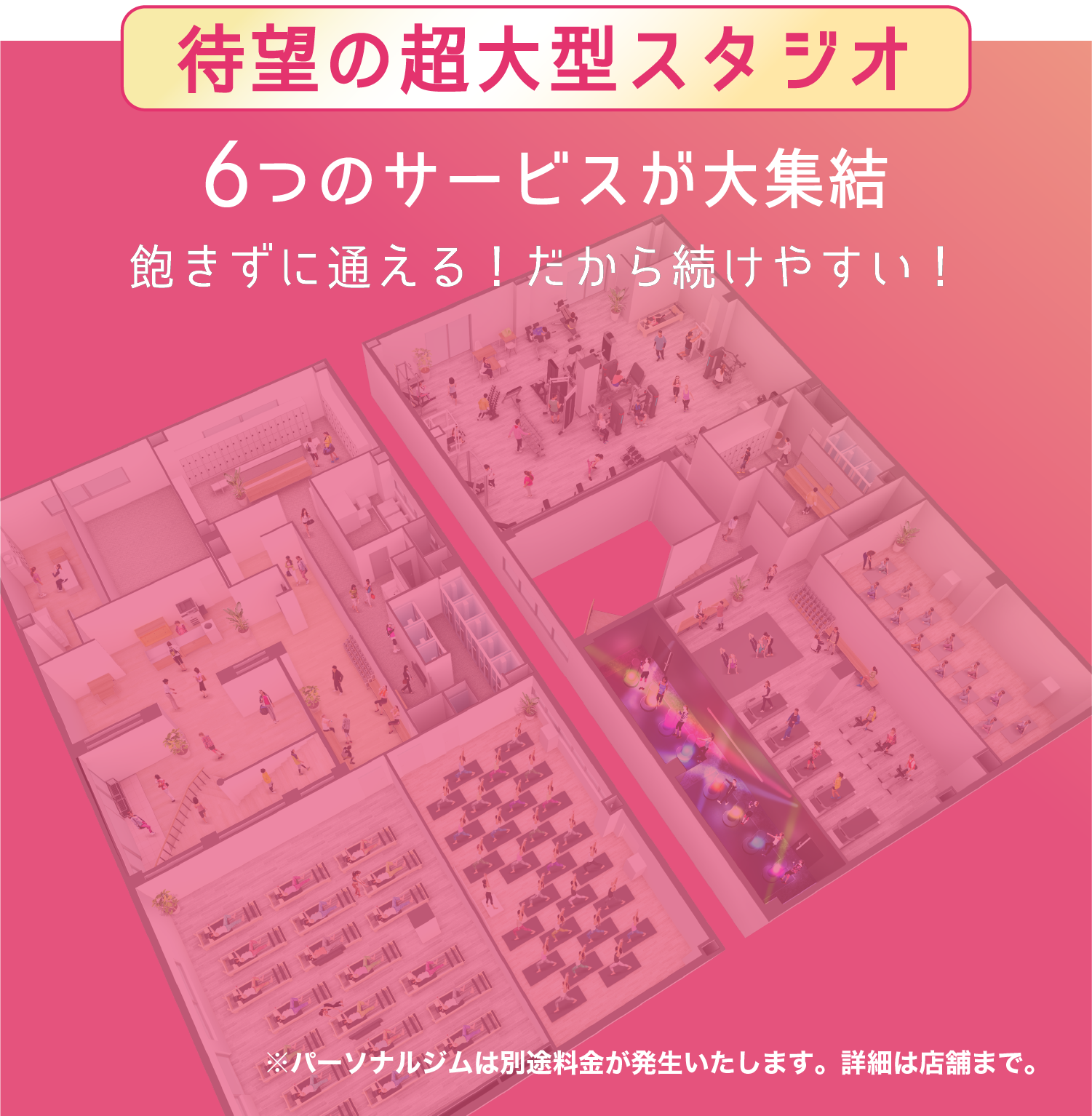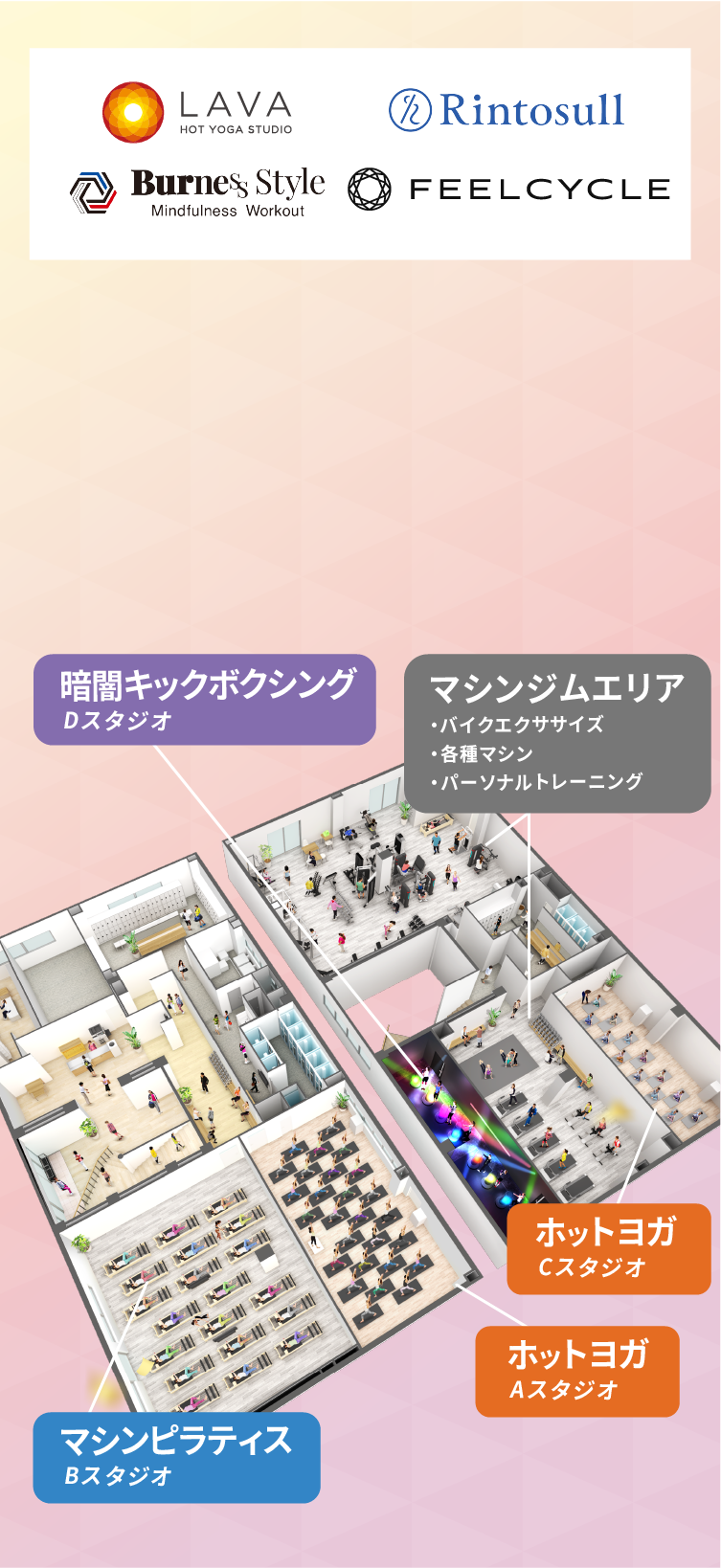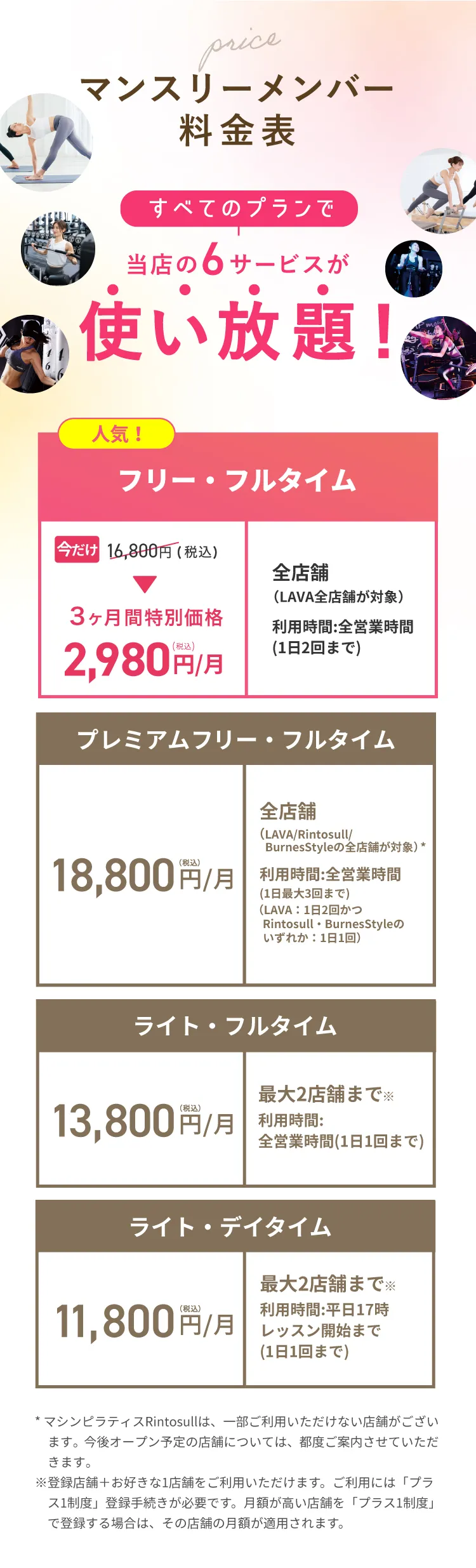 - ※利用開始月を含む3ヶ月間、対象ブランド全店通い放題コース[16,800円/月]を特別価格[2,980円/月]に割引いたします。<対象ブランド:LAVA・Rintosull・BurnesStyle・FIVE ELEMENT FIT・UPPER 9>
