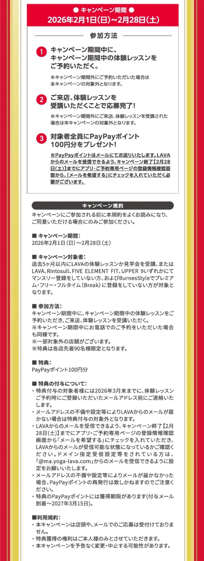 - ※過去5ヶ月以内にLAVAの体験レッスンか見学会を受講、またはLAVA、Rintosull、FIVE ELEMENT FIT、UPPER 9いずれかにてマンスリー登録をしていない方、およびBurnesStyleでプレミアム フリー・フルタイム(Break)に登録をしていない方が対象となります。