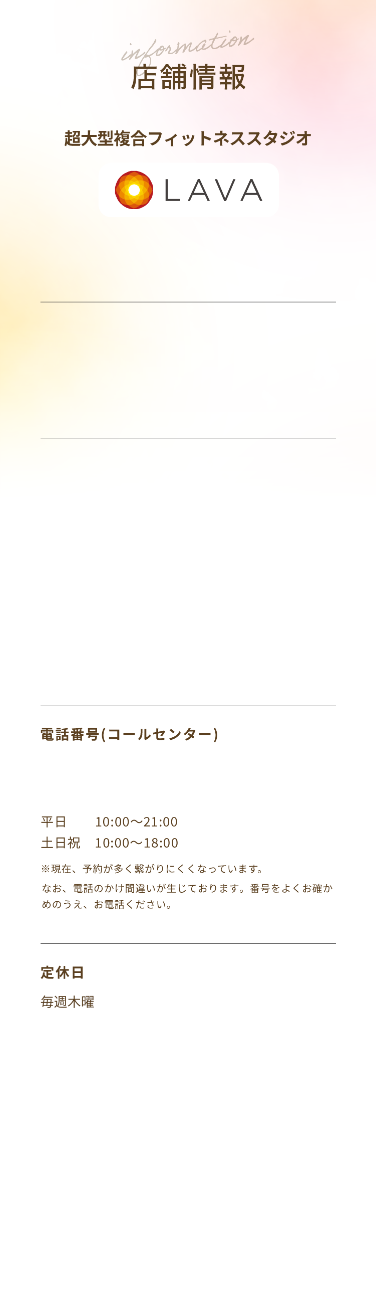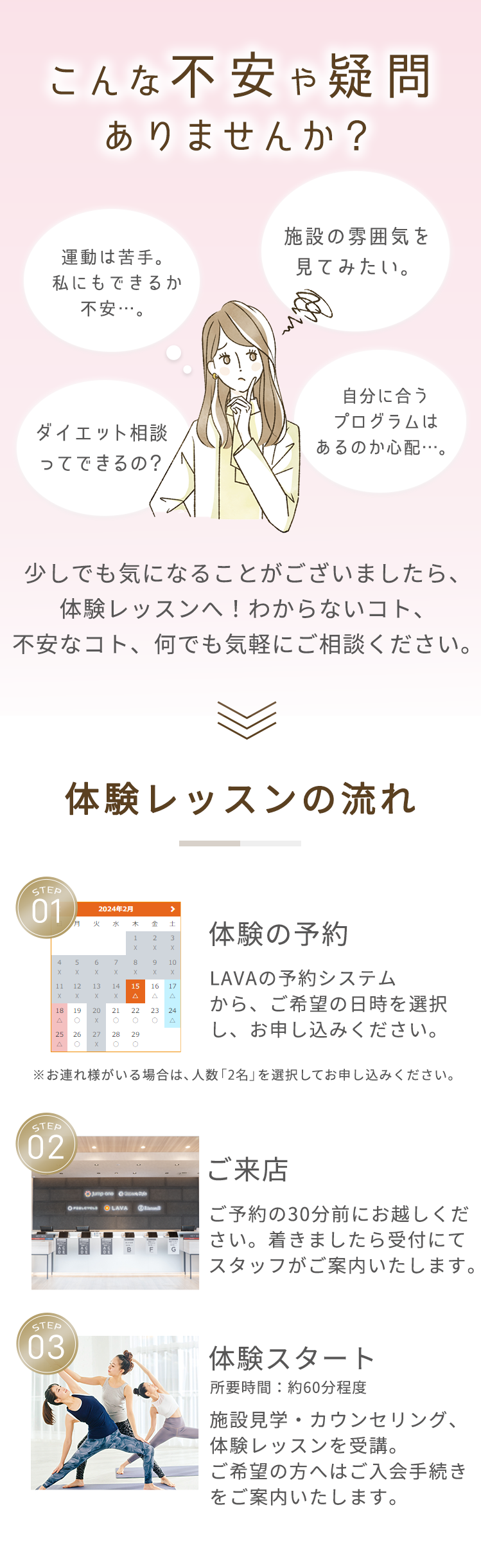 - ※過去5ヶ月以内にLAVAの体験レッスンか見学会を受講、またはLAVA、Rintosull、FIVE ELEMENT FIT、UPPER 9いずれかにてマンスリー登録をしていない方、およびBurnesStyleでプレミアム・フリー・フルタイム(Break)に登録をしていない方が対象となります。