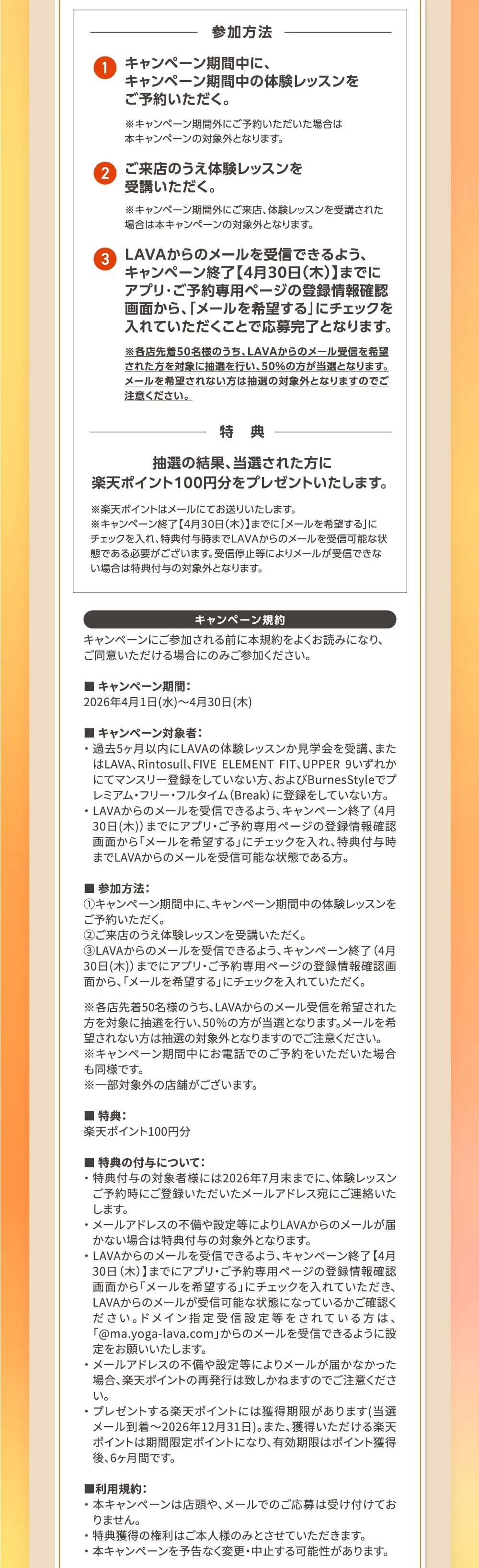 - ※過去5ヶ月以内にLAVAの体験レッスンか見学会を受講、またはLAVA、Rintosull、FIVE ELEMENT FIT、UPPER 9いずれかにてマンスリー登録をしていない方、およびBurnesStyleでプレミアム フリー・フルタイム(Break)に登録をしていない方が対象となります。