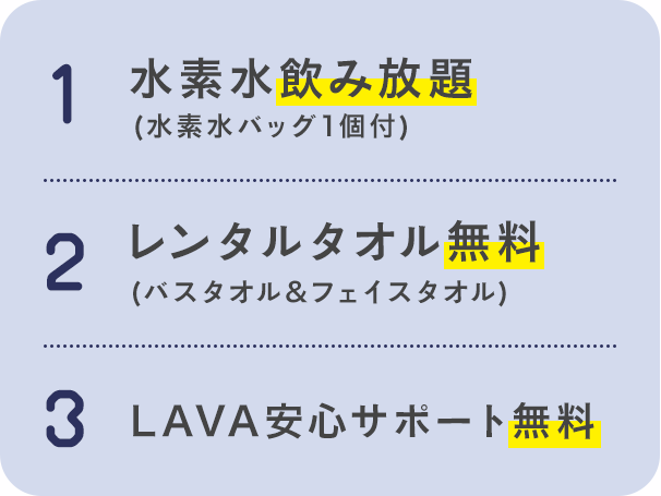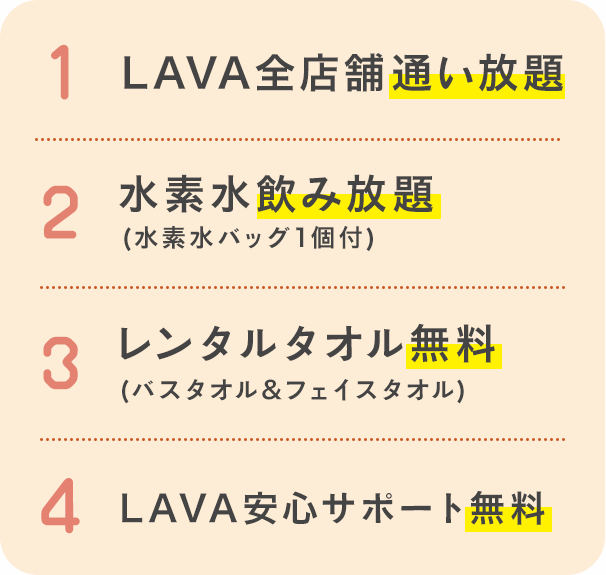 - ※利用開始月を含む3ヶ月間、対象ブランド全店通い放題コース[16,800円/月]を特別価格[2,980円/月]に割引いたします。<対象ブランド:LAVA・Rintosull・BurnesStyle・FIVE ELEMENT FIT・UPPER 9>