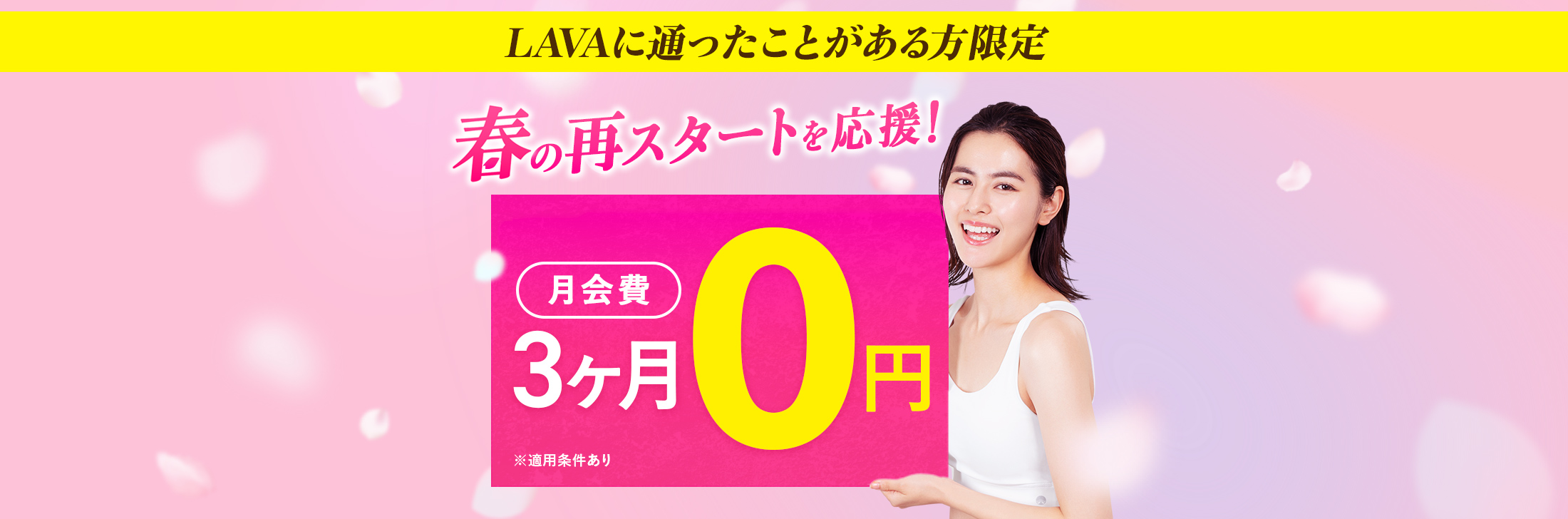 入会したことがある方で過去5ヶ月以内にLAVAの体験レッスンか見学会を受講、またはLAVA、Rintosull、FIVE ELEMENT FIT、UPPER 9いずれかにてマンスリー登録をしていない方およびBurnesStyleでプレミアムフリー・フルタイム (Break) に登録をしていない方が対象となります。