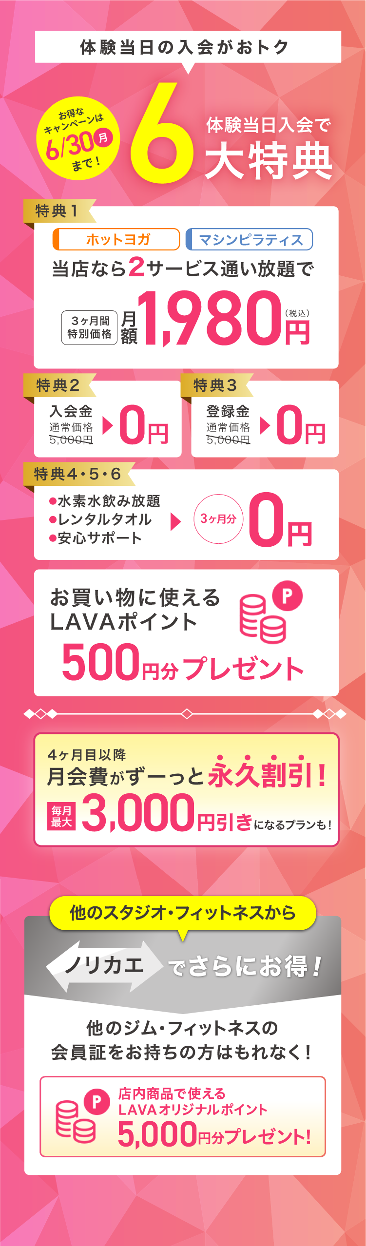 ※過去5ヶ月以内にLAVAを体験またはLAVAかRintosullにてマンスリー登録をしていない方が対象となります。