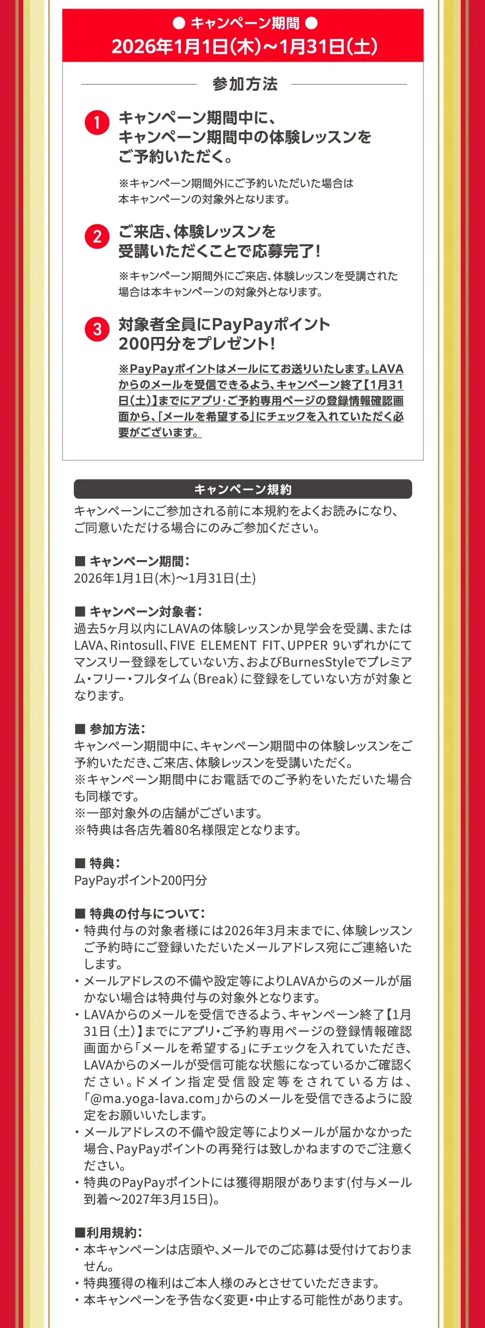 またはLAVA、Rintosull、FIVE ELEMENT FIT、UPPER 9いずれかにてマンスリー登録をしていない方、およびBurnesStyleでプレミアム フリー・フルタイム(Break)に登録をしていない方が対象となります。