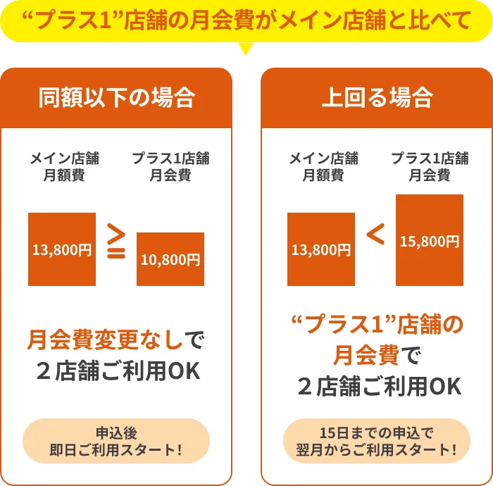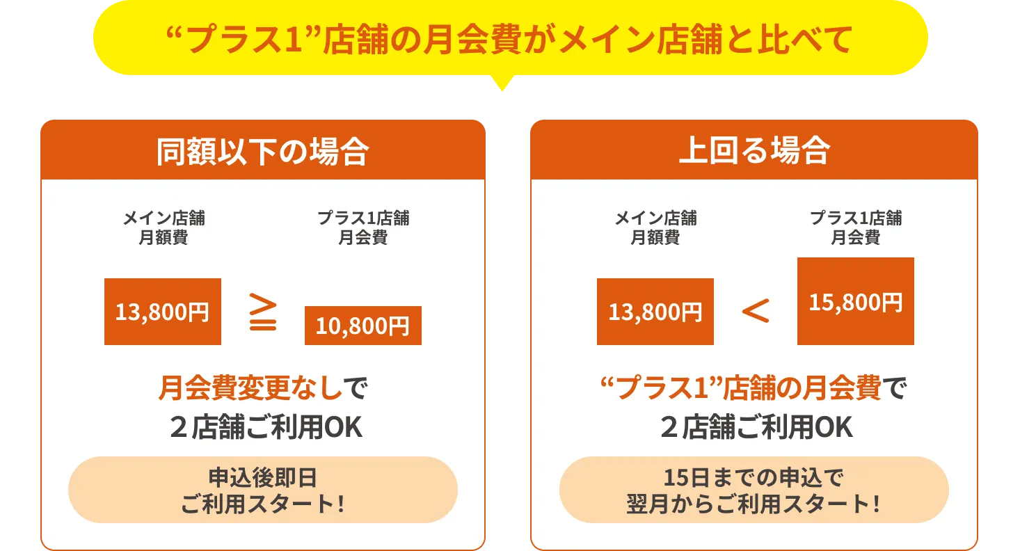 現在ご登録いただいている店舗(メイン店舗)に加えて、プラス1店舗を設定いただくことで、