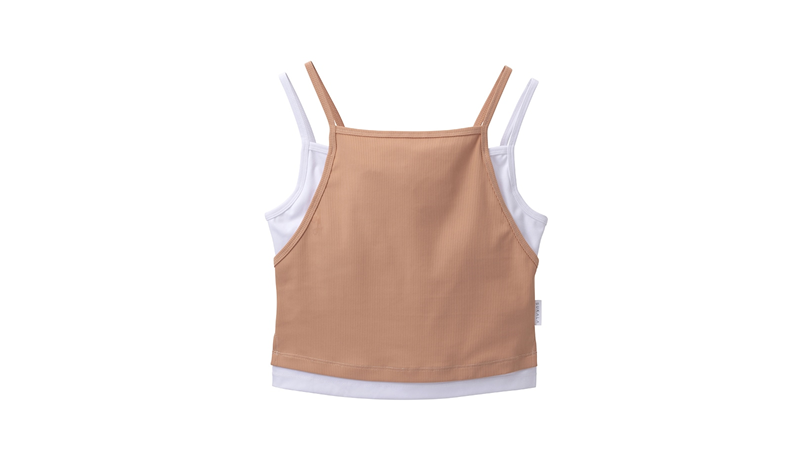 ■1枚で完成するレイヤードスタイル。カップ付きで、レッスンでも普段使いでも活躍の1枚