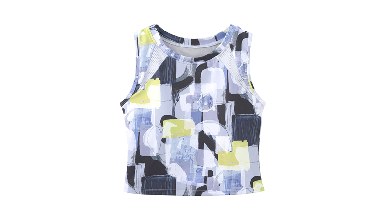■縫い目の少ないニットのカップ付きTシャツは、レースのような花柄がポイント。スポーツはもちろん普段使いもOK