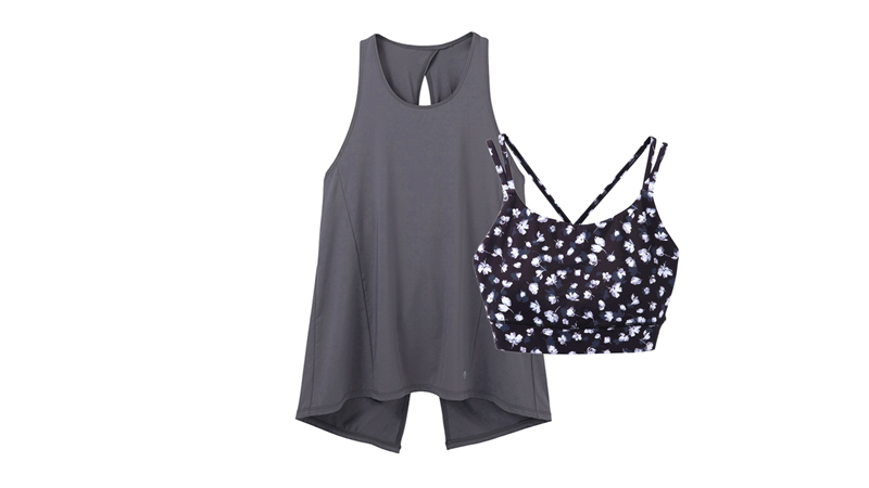 様々な着こなしが叶う2点セットのお得なアイテム。タンクトップは、気になる腰やお尻周りをカバーしてくれます。ブラトップは、細いストラップのシンプルなデザインでバックスタイルまで美しく見せてくれます。プリントの発色が良く、もっちりとした肌触りのストレッチ性に優れた肌なじみの良い吸水速乾素材を使用。抗菌・防臭加工も施しており、ホットヨガに最適です。