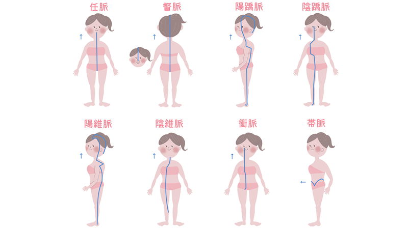 任脈、督脈、衝脈、帯脈、陰きょう脈、陽きょう脈、陰維脈、陽維脈