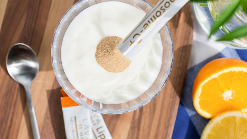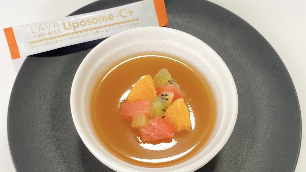 LAVA×BE-MAX Liposome-C+は溶けやすい顆粒状のため水なしでもサッと摂取できるのが特徴ですが、たまにはアレンジして楽しみたい!という方におススメの簡単レシピです。