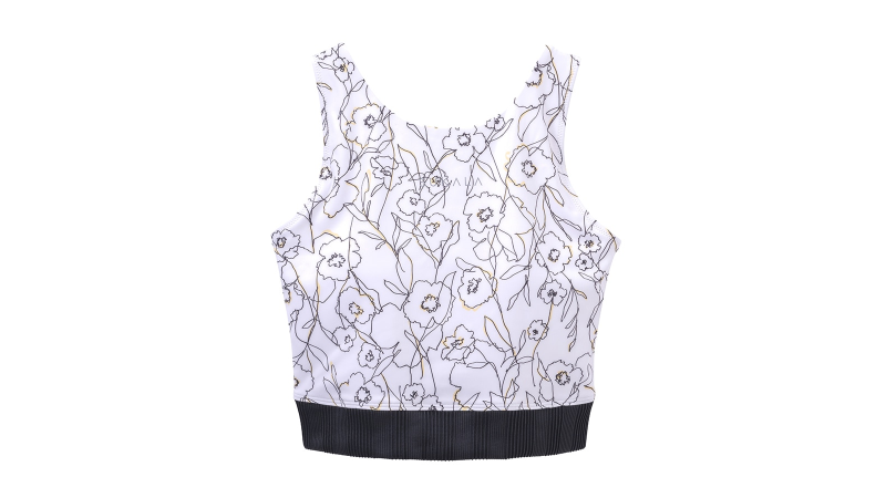 立体的で様々なカラーの刺繍風のプリントが華やかなシリーズ。一体型モールドカップがバストをきれいに見せてくれ、アンダーバスト部分の幅広ゴムでしっかりとバストを支えます。肩甲骨の動きをさまたげることなく、アクティブな動きにも対応。ストレッチ性に優れた肌なじみの良い素材を使用。抗菌・防臭加工を施した、ホットヨガに最適な一枚です。