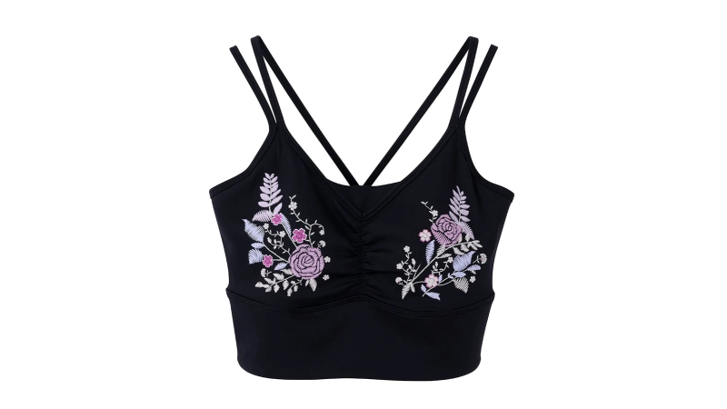 ■立体的な刺繍風のフラワープリントが新しい。ストレスフリーに動けるクロスタイプのブラトップ