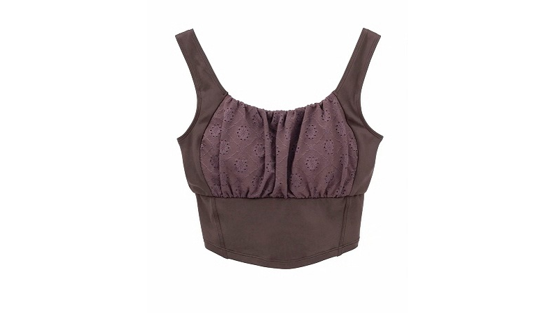 一体型モールドカップがバストをきれいに見せてくれる、短すぎないビスチェ風デザインのブラトップです。胸元のレース使いが甘く華やか。女性らしさを引き立ててくれます。ハイウエストレギンスと組み合わせるとスタイルアップ効果大。ストレッチ性に優れた肌なじみの良い吸水速乾、抗菌・防臭素材を使用。パーカーとの相性も抜群!ソフトで締め付け感のない優しい着心地。どんな動きにもフィットしやすくなっています。
