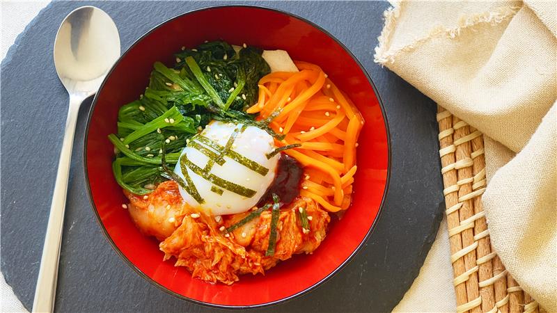 3.豆腐の上にほうれん草・にんじん・キムチ・温泉卵を盛り付ける。白だし・醤油・ごま油を回しかけ、コチュジャンを添える。