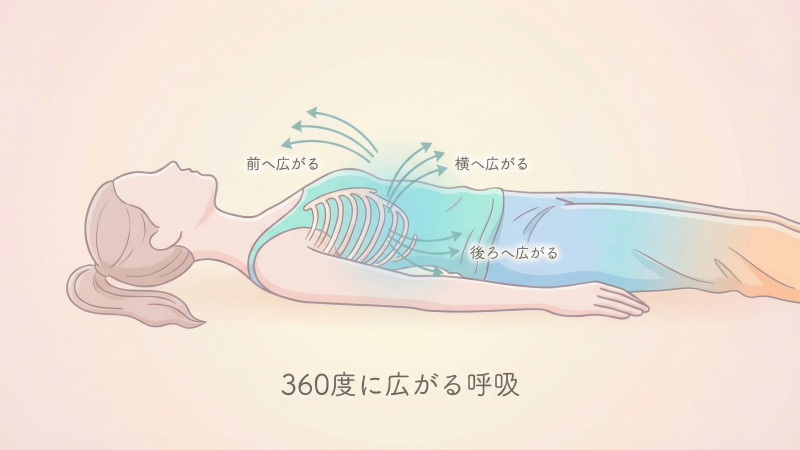 それそれ!ラテラル呼吸は、360度に広がる呼吸を目指すんだ。横も後ろも、肋骨全体を使って呼吸するイメージでね。