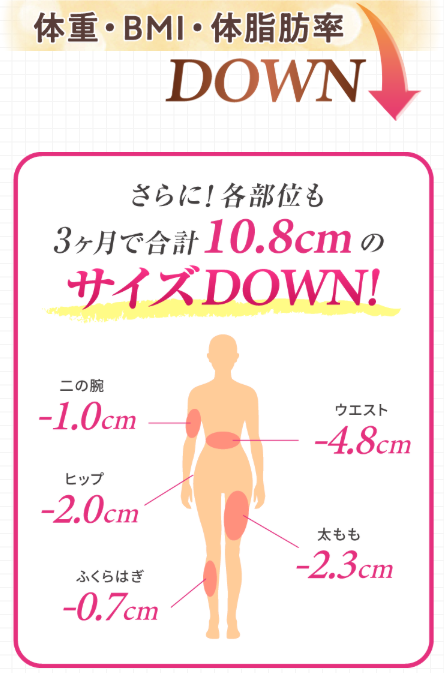 ■体重、BMI、体脂肪率の低下に加え、各部位も3ヶ月で合計10.8cmのサイズDOWN